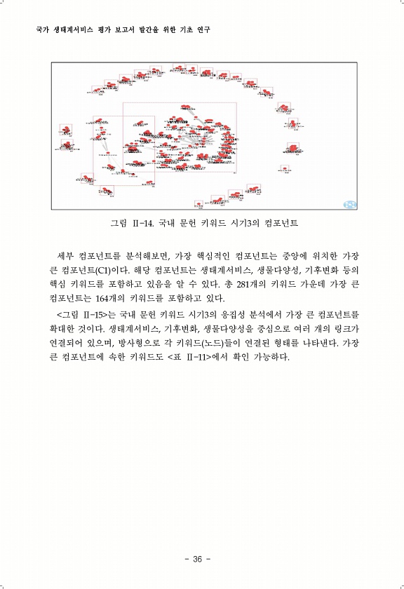 국가 생태계서비스 평가 보고서 발간을 위한 기초 연구 36 그림 Ⅱ 14. 국내 문헌 키워드 시기3의 컴포넌트 세부 컴포넌트를 분석해보면, 가장 핵심적인 컴포넌트는 중앙에 위치한 가장 큰 컴포넌트 C1 이다. 해당 컴포넌트는 생태계서비스, 생물다양성, 기후변화 등의 핵심 키워드를 포함하고 있음을 알 수 있다. 총 281개의 키워드 가운데 가장 큰 컴포넌트는 164개의 키워드를 포함하고 있다. 그림 Ⅱ 15 는 국내 문헌 키워드 시기3의 응집성 분석에서 가장 큰 컴포넌트를 확대한 것이다. 생태계서비스, 기후변화, 생물다양성을 중심으로 여러 개의 링크가 연결되어 있으며, 방사형으로 각 키워드 노드 들이 연결된 형태를 나타낸다. 가장 큰 컴포넌트에 속한 키워드도 표 Ⅱ 11 에서 확인가능하다.
