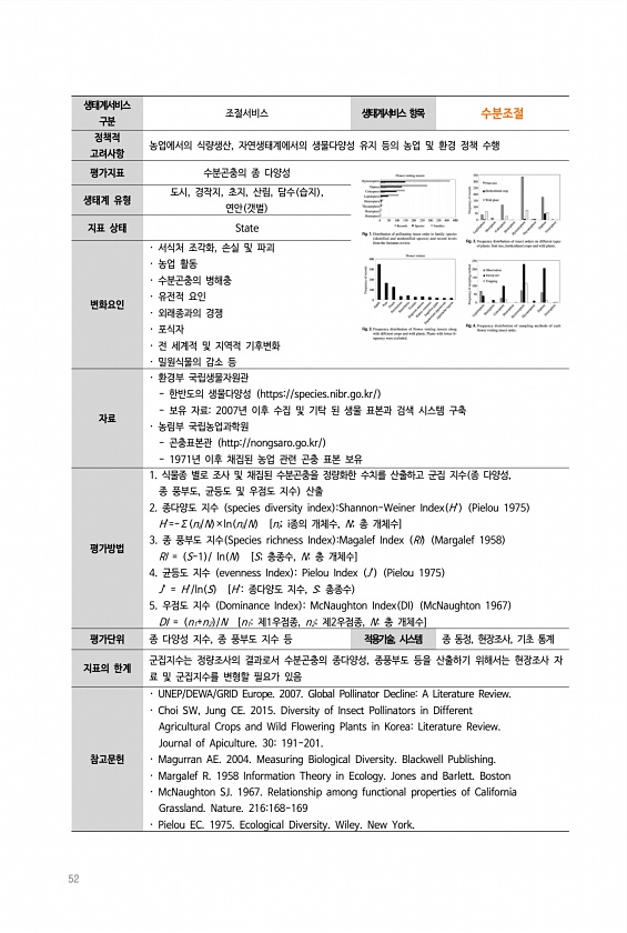 52 생태계서비스 구분 조절서비스 생태계서비스 항목 수분조절 정책적 고려사항 농업에서의 식량생산, 자연생태계에서의 생물다양성 유지 등의 농업 및 환경 정책 수행 평가지표 수분곤충의 종 다양성 생태계 유형 도시, 경작지, 초지, 산림, 담수 습지 , 연안 갯벌 지표 상태 State 변화요인 · 서식처 조각화, 손실 및 파괴 · 농업 활동 · 수분곤충의 병해충 · 유전적 요인 · 외래종과의 경쟁 · 포식자 · 전 세계적 및 지역적 기후변화 · 밀원식물의 감소 등 자료 · 환경부 국립생물자원관 한반도의 생물다양성 https//species.nibr.go.kr/ 보유 자료2007년 이후 수집 및 기탁 된 생물 표본과 검색 시스템 구축 · 농림부 국립농업과학원 곤충표본관 http//nongsaro.go.kr/ 197...