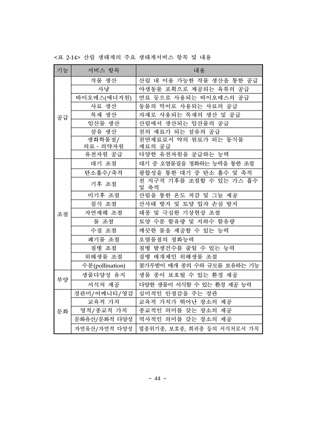 44 기능 서비스 항목 내용 공급 작물 생산 산림 내 이용 가능한 작물 생산을 통한 공급 사냥 야생동물 포획으로 제공되는 육류의 공급 바이오매스 에너지원 연료 등으로 사용되는 바이오매스의 공급 사료 생산 동물의 먹이로 사용되는 사료의 공급 목재 생산 자재로 사용되는 목재의 생산 및 공급 임산물 생산 산림에서 생산되는 임산물의 공급 섬유 생산 천의 재료가 되는 섬유의 공급 생화학물질 의료 의약자원 천연재료로서 약의 원료가 되는 동식물 재료의 공급 유전자원 공급 다양한 유전자원을 공급하는 능력 조절 대기 조절 대기 중 오염물질을 정화하는 능력을 통한 조절 탄소흡수 축적 광합성을 통한 대기 중 탄소 흡수 및 축적 기후 조절 전 지구적 기후를 조절할 수 있는 가스 흡수 및 축적 미기후 조절 산림을 통한 온도 저감 ...