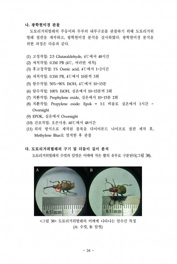34 나. 광학현미경 관찰 도토리거위벌레의 주둥이와 두부의 내부구조를 관찰하기 위해 도토리거위 벌레 절편을 제작하고, 광학현미경 분석을 실시하였다. 광학현미경 분석을 위한 과정은 다음과 같다. 1 고정작업2.5 Glutaraldehyde, 4℃에서 48시간 2 세척작업0.1M PB 4℃, 여러번 세척 3 후고정작업1% Osmic acid, 4℃에서 12시간 4 세척작업0.1M PB, 4℃에서 10분씩 3회 5 탈수작업50%90% EtOH, 4℃에서 1015분 6 탈수작업100% EtOH, 실온에서 1015분씩 3회 7 치환작업Prophylene oxide, 실온에서 1015분 2회 8 치환작업Propylene oxideEpok = 11 비율로 실온에서 1시간 Overnight 9 EPOK, 실온에서 Over...