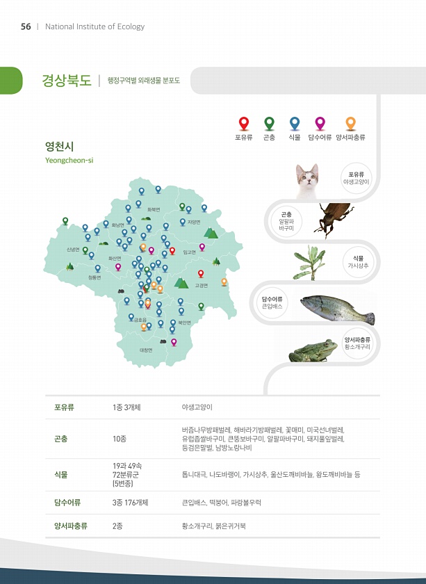 경상북도 행정구역별 외래생물 분포도 북안면 대창면 금호읍 고경면 임고면 자양면 화북면 화남면 화산면 청통면 신녕면 영천시 Yeongcheon-si 양서파충류 황소개구리 포유류 1종 3개체 야생고양이 곤충 10종 버즘나무방패벌레, 해바라기방패벌레, 꽃매미, 미국선녀벌레, 유럽좁쌀바구미, 큰뚱보바구미, 알팔파바구미, 돼지풀잎벌레, 등검은말벌, 남방노랑나비 식물 19과 49속 72분류군 5변종 톱니대극, 나도바랭이, 가시상추, 울산도깨비바늘, 왕도깨비바늘 등 담수어류 3종 176개체 큰입배스, 떡붕어, 파랑볼우럭 양서파충류 2종 황소개구리, 붉은귀거북 포유류 곤충 식물 담수어류 양서파충류 포유류 야생고양이 담수어류 큰입배스 식물 가시상추 곤충 알팔파 바구미 56 National Institute ofEcology