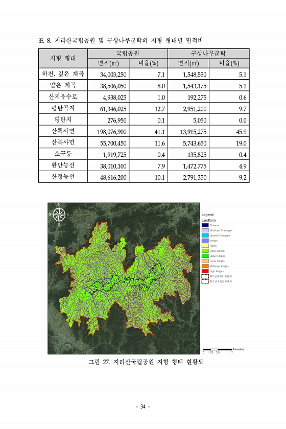34 지형 형태 국립공원 구상나무군락 면적 ㎡ 비율 % 면적 ㎡ 비율 % 하천, 깊은 계곡 34,003,250 7.1 1,548,550 5.1 얕은 계곡 38,506,050 8.0 1,543,175 5.1 산지유수로 4,938,025 1.0 192,275 0.6 평탄곡지 61,346,025 12.7 2,951,200 9.7 평탄지 276,950 0.1 5,050 0.0 산록사면 198,076,900 41.1 13,915,275 45.9 산복사면 55,700,450 11.6 5,743,650 19.0 소구릉 1,919,725 0.4 135,825 0.4 완만능선 38,010,100 7.9 1,472,775 4.9 산정능선 48,616,200 10.1 2,791,350 9.2 표 8. 지리산국립공원 및 구상나무...