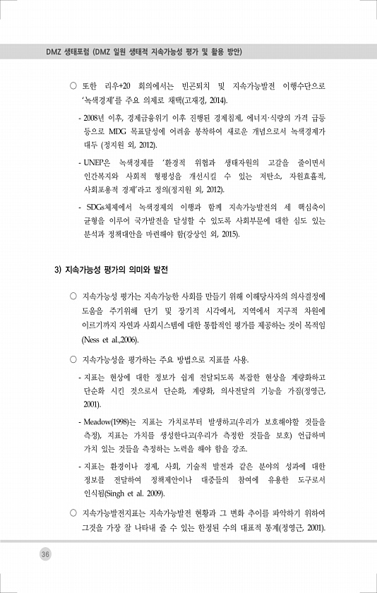 36 DMZ 생태포럼 DMZ 일원 생태적 지속가능성 평가 및 활용 방안 ○ 또한 리우+20 회의에서는 빈곤퇴치 및 지속가능발전 이행수단으로 ‘녹색경제’를 주요 의제로 채택 고재경, 2014 2008년 이후, 경제금융위기 이후 진행된 경제침제, 에너지·식량의 가격 급등 등으로 MDG 목표달성에 어려움 봉착하여 새로운 개념으로서 녹색경제가 대두 정지원 외, 2012 UNEP은 녹색경제를 ‘환경적 위협과 생태자원의 고갈을 줄이면서 인간복지와 사회적 형평성을 개선시킬 수 있는 저탄소, 자원효휼적, 사회포용적 경제’라고 정의 정지원 외, 2012 SDGs체제에서 녹색경제의 이행과 함께 지속가능발전의 세 핵심축이 균형을 이루어 국가발전을 달성할 수 있도록 사회부문에 대한 심도 있는 분석과 정책대안을 마련해야 함 강상인...