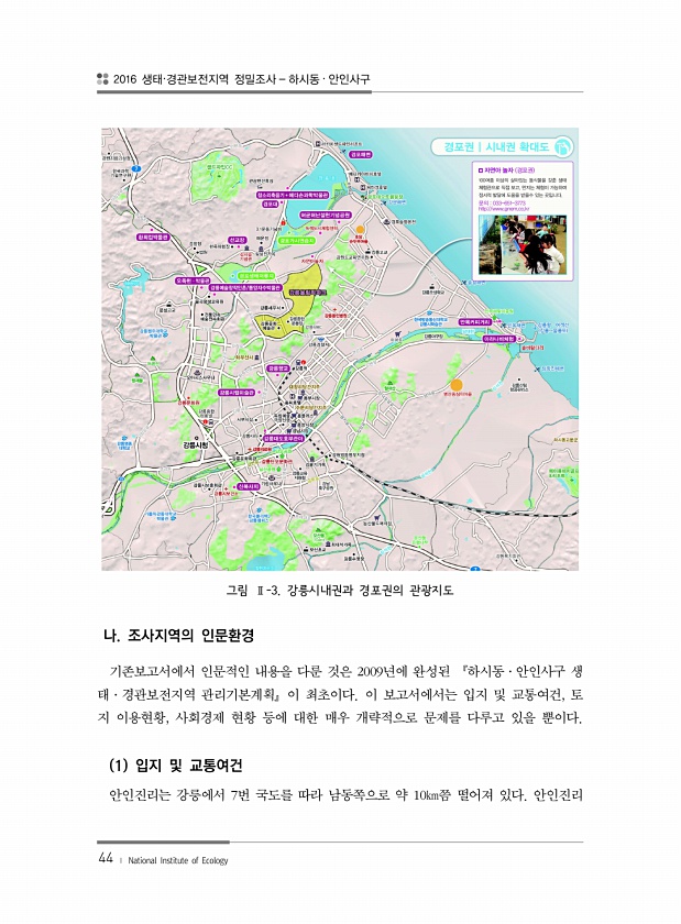 2016 생태·경관보전지역 정밀조사 하시동 · 안인사구 44 ? National Institute of Ecology 그림 Ⅱ-3. 강릉시내권과 경포권의 관광지도 나. 조사지역의 인문환경 기존보고서에서 인문적인 내용을 다룬 것은 2009년에 완성된 『하시동·안인사구 생 태·경관보전지역 관리기본계획』이 최초이다. 이 보고서에서는 입지 및 교통여건, 토 지 이용현황, 사회경제 현황 등에 대한 매우 개략적으로 문제를 다루고 있을 뿐이다. 1 입지 및 교통여건 안인진리는 강릉에서 7번 국도를 따라 남동쪽으로 약 10㎞쯤 떨어져 있다.안인진리