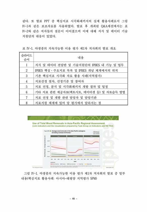 표 IV-1. 야생종의 지속가능한 이용 평가 제1차 저자회의 발표 개요 슬라이드 순서 내용 1 지식 및 데이터 전담반 및 기술지원단의 IPBES 내 기능 및 업무 2 IPBES 핵심·주요지표 목록 및 IPBES 개념 체계에서의 위치 3 기존 핵심지표 시각화 자료 활용 사례 지역평가 4 지표선정 절차, 선정기준 및 참여자 5 지표 선정, 분석 및 시각화패키지 개발 절차 및 일정 6 기타 지표 관련 제공자료 팩트시트, 데이터셋 등 및 자료습득 방법 7 지표 선정 및 개발 관련 담당자 및 담당기관 8 지표지원 체계에 있어 당 평가에서 달라지는 점 그림 IV-1. 야생종의 지속가능한 이용 평가 제1차 저자회의 발표 중 일부 내용 핵심지표 활용사례아시아-태평양 지역평가 SPM 같다. 또 발표 PPT 중 핵심지표 시각...