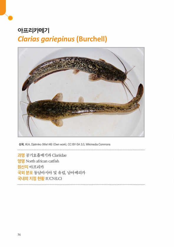 56 아프리카메기 Clarias gariepinus Burchell 과명 공기호흡메기과 Clariidae 영명 North african catfish 원산지 아프리카 국외 분포 동남아시아 및 유럽, 남아메리카 국내외 지정 현황 IUCN LC 성체. W.A. Djatmiko Wie146 Own work , CC BY-SA 3.0, WikimediaCommons