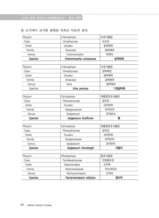 2015 전국 무인도서 자연환경조사 완도 권역 46 ? National Institute of Ecology 본 도서에서 조사한 출현종 목록은 다음과 같다. Phylum Chlorophyta 녹조식물문 Class Ulvophyceae 녹조강 Order Ulvales 갈파래목 Family Ulvaceae 갈파래과 Genus Enteromorpha 파래속 Species Enteromorpha compressa 납작파래 Phylum Chlorophyta 녹조식물문 Class Ulvophyceae 갈파래강 Order Ulvales 갈파래목 Family Ulvaceae 갈파래과 Genus Ulva 갈파래속 Species Ulva pertusa 구멍갈파래 Phylum Ochrophyta 대롱편모조식물문 Class Ph...
