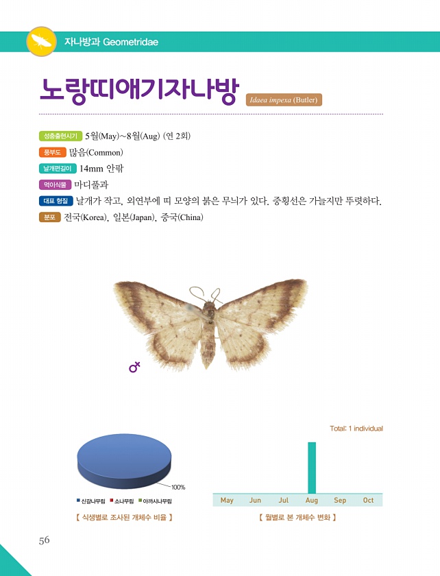 56 자나방과 Geometridae 성충출현시기 5월 May 8월 Aug 연 2회 풍부도 많음 Common 날개편길이 14mm 안팎 먹이식물 마디풀과 대표 형질 날개가 작고, 외연부에 띠 모양의 붉은 무늬가 있다. 중횡선은 가늘지만 뚜렷하다. 분포 전국 Korea , 일본 Japan , 중국 China 노랑띠애기자나방 Idaea impexa Butler 【 식생별로 조사된 개체수 비율 】 100% 신갈나무림 소나무림 아까시나무림 【 월별로 본 개체수 변화 】 Total1 individual May Jun Jul Aug SepOct