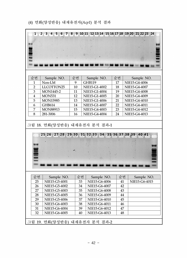 순번 Sample NO. 순번 Sample NO. 순번 Sample NO. 1 Non-LM 9 GHB119 17 NIE15-G4-4006 2 LLCOTTON25 10 NIE15-G1-4002 18 NIE15-G4-4007 3 MON1445-2 11 NIE15-G1-4004 19 NIE15-G4-4008 4 MON531 12 NIE15-G1-4005 20 NIE15-G4-4009 5 MON15985 13 NIE15-G1-4006 21 NIE15-G4-4010 6 GHB614 14 NIE15-G1-4007 22 NIE15-G4-4011 7 MON88913 15 NIE15-G4-4003 23 NIE15-G4-4012 8 281-3006 16 NIE15-G4-4004 24 NIE15-G4-4013 그림 18. 면화...
