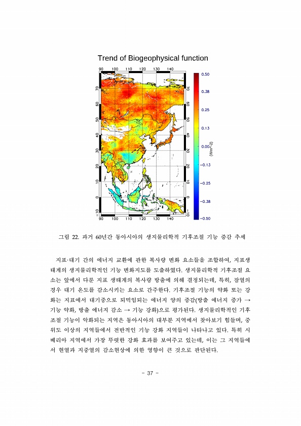 37 그림 22. 과거 60년간 동아시아의 생지물리학적 기후조절 기능 증감 추세 지표·대기 간의 에너지 교환에 관한 복사량 변화 요소들을 조합하여, 지표생 태계의 생지물리학적인 기능 변화지도를 도출하였다. 생지물리학적 기후조절 요 소는 앞에서 다룬 지표 생태계의 복사량 방출에 의해 결정되는데, 특히, 잠열의 경우 대기 온도를 감소시키는 요소로 간주한다. 기후조절 기능의 약화 또는 강 화는 지표에서 대기중으로 되먹임되는 에너지 양의 증감 방출 에너지 증가 → 기능 약화, 방출 에너지 감소 → 기능 강화 으로 평가된다. 생지물리학적인 기후 조절 기능이 악화되는 지역은 동아시아의 대부분 지역에서 찾아보기 힘들며, 중 위도 이상의 지역들에서 전반적인 기능 강화 지역들이 나타나고 있다. 특히 시 베리아 지역에서 가장...
