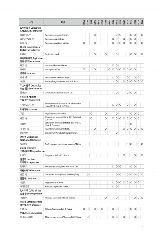 53 노박덩굴목 Celastrales 노박덩굴과 Celastraceae 좀참빗살나무 Euonymus bungeanus Maxim. ○ ○ ○ ○ ○ ○ 좁은잎참빗살나무 Euonymus maackii Rupr. ○ ○ ○ ○ ○ ○ ○ 회목나무 Euonymus pauciforus Maxim. ○ ○ ○ ○ ○ ○ ○ ○ ○ ○ 대극목 Euphorbiales 대극과 Euphorbiaceae 흰대극 Euphorbia esula L. ○ ○ ○ ○ ○ ○ 무환자나무목 Sapindales 단풍나무과 Aceraceae 복장나무 Acer mandshuricum Maxim. ○ ○ 복자기 Acer triforum Kom. ○ ○ ○ ○ ○ ○ ○ ○ ○ ○ 운향과 Rutaceae 황벽나무 Phellodendron amur...
