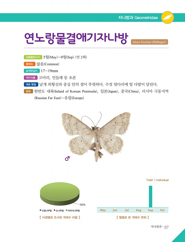 자나방과?57 자나방과 Geometridae 성충출현시기 5월 May 9월 Sep 연 2회 풍부도 많음 Common 날개편길이 1719mm 먹이식물 고마리, 민들레 등 초본 대표 형질 날개 외횡선과 중실 안의 점이 뚜렷하다. 수컷 뒷다리에 털 다발이 달린다. 분포 한반도 내륙 Inland of Korean Peninsula , 일본 Japan , 중국 China , 러시아 극동지역 Russian Far East 유럽 Europe 연노랑물결애기자나방 Idaea biselata H?fnagel 【 월별로 본 개체수 변화 】 Total1 individual 【 식생별로 조사된 개체수 비율 】 100% 신갈나무림 소나무림 아까시나무림 May Jun Jul Aug SepOct