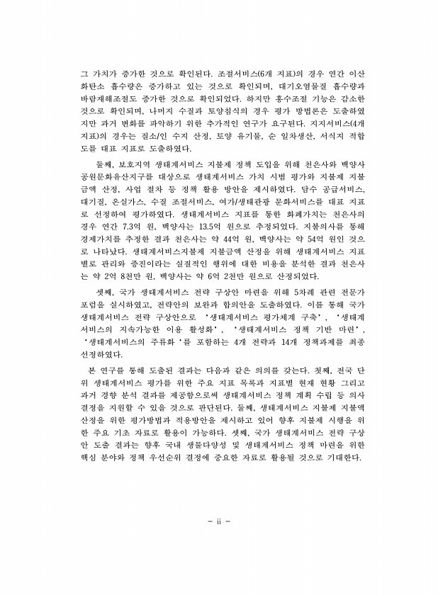 ii 그 가치가 증가한 것으로 확인된다. 조절서비스 6개 지표 의 경우 연간 이산 화탄소 흡수량은 증가하고 있는 것으로 확인되며, 대기오염물질 흡수량과 바람재해조절도 증가한 것으로 확인되었다. 하지만 홍수조절 기능은 감소한 것으로 확인되며, 나머지 수질과 토양침식의 경우 평가 방법론은 도출하였 지만 과거 변화를 파악하기 위한 추가적인 연구가 요구된다. 지지서비스 4개 지표 의 경우는 질소/인 수지 산정, 토양 유기물, 순 일차생산, 서식지 적합 도를 대표 지표로 도출하였다. 둘째, 보호지역 생태계서비스 지불제 정책 도입을 위해 천은사와 백양사 공원문화유산지구를 대상으로 생태계서비스 가치 시범 평가와 지불제 지불 금액 산정, 사업 절차 등 정책 활용 방안을 제시하였다. 담수 공급서비스, 대기질, 온실가스, 수...