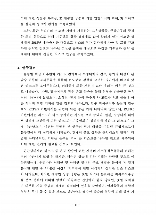 ii 도에 대한 생물종 부적응, 2 해수면 상승에 의한 연안서식지 피해, 3 먹이그 물 불일치 등 3개 평가를 수행하였다. 또한, 최근 우리나라 아고산 지역에 서식하는 고유생물종, 구상나무의 급격 한 쇠퇴 현상으로 인해 기후변화 취약 생태계로 많이 알려져 있는 아고산 생 태계와 2018년 내륙습지를 대상으로 리스크 평가 결과에서 가뭄 및 토양 건조 화에 취약할 것으로 나타난 고산성 습지를 대상으로 특정한 기후변화 취약 생 태계에 대하여 정밀한 리스크 연구를 수행하였다. 4. 연구결과 유형별 핵심 기후변화 리스크 평가에서 수생태계의 경우, 평가의 대상이 된 담수 어류와 저서무척추 동물의 온도상승 경향을 고려한 평가에서 비교적 낮 은 리스크를 보여주었으나, 외래종에 의한 서식지 교란 우려는 매우 큰 것으 로 나...