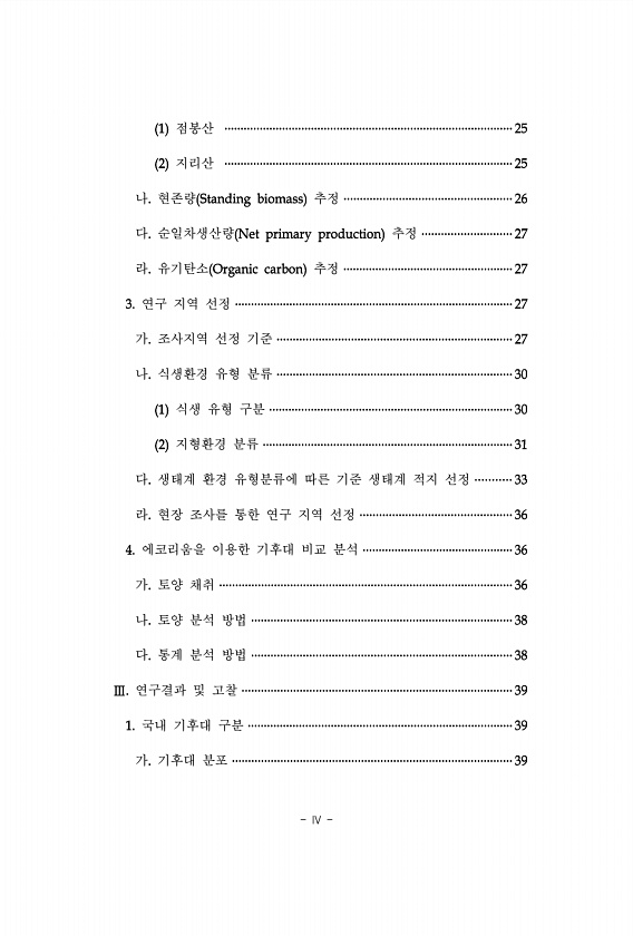 IV 점봉산 지리산 나 현존량 추정 다 순일차생산량 추정 라 유기탄소 추정 연구 지역 선정 가 조사지역 선정 기준 나 식생환경 유형 분류 식생 유형 구분 지형환경 분류 다 생태계 환경 유형분류에 따른 기준 생태계 적지 선정 라 현장 조사를 통한 연구 지역 선정 에코리움을 이용한 기후대 비교 분석 가 토양 채취 나 토양 분석 방법 다 통계 분석 방법 연구결과 및 고찰 국내 기후대 구분 가 기후대분포