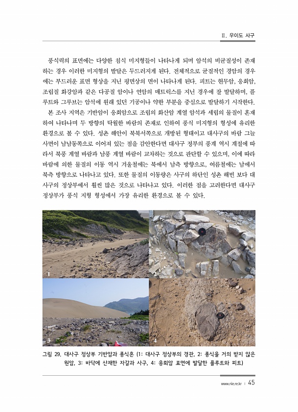Ⅱ. 우이도 사구 www.nie.re.kr ? 45 풍식력의 표면에는 다양한 침식 미지형들이 나타나게 되며 암석의 비균질성이 존재 하는 경우 이러한 미지형의 발달은 두드러지게 된다. 전체적으로 균질적인 경암의 경우 에는 부드러운 표면 형상을 지닌 평면상의 면이 나타나게 된다. 피트는 현무암, 응회암, 조립질 화강암과 같은 다공질 암이나 연암의 매트릭스를 지닌 경우에 잘 발달하며, 플 루트와 그루브는 암석에 원래 있던 기공이나 약한 부분을 중심으로 발달하기 시작한다. 본 조사 지역은 기반암이 응회암으로 조립의 화산암 계열 암석과 세립의 물질이 혼재 하여 나타나며 두 방향의 탁월한 바람의 존재로 인하여 풍식 미지형의 형성에 유리한 환경으로 볼 수 있다. 성촌 해안이 북북서쪽으로 개방된 형태이고 대사구의 바람 그...