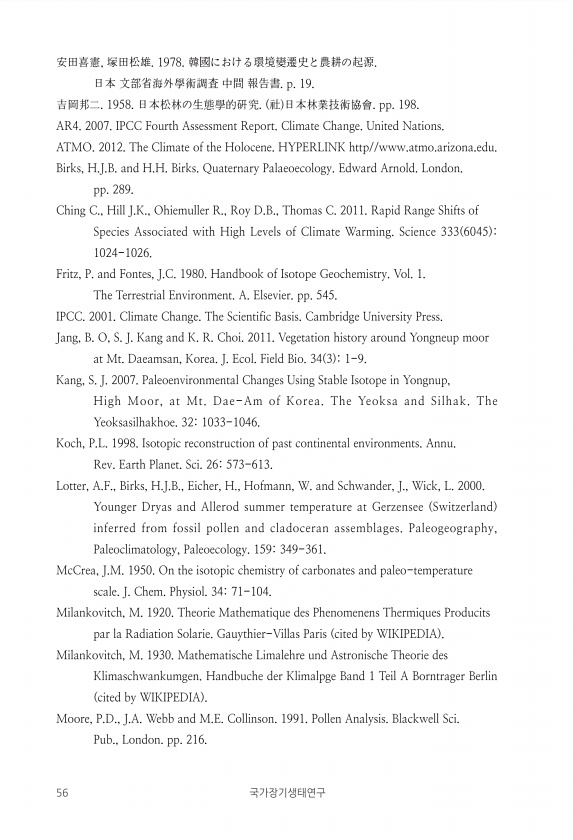 56 국가장기생태연구 安田喜憲, 塚田松雄. 1978. 韓國における環境變遷史と農耕の起源. 日本 文部省海外學術調査 中間 報告書. p. 19. 吉岡邦二. 1958. 日本松林の生態學的硏究. 社 日本林業技術協會. pp. 198. AR4. 2007. IPCC Fourth Assessment Report. Climate Change. United Nations. ATMO. 2012. The Climate of the Holocene. HYPERLINK http//www.atmo.arizona.edu. Birks, H.J.B. and H.H. Birks. Quaternary Palaeoecology. Edward Arnold. London. pp. 289. Ching C., Hill J.K., Ohiemuller R., ...
