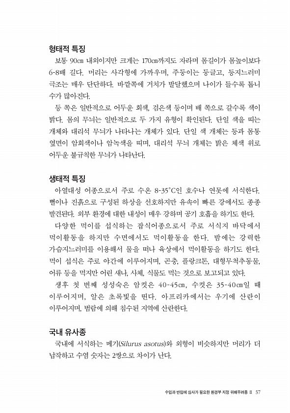 수입과 반입에 심사가 필요한 환경부 지정 위해우려종 Ⅱ 57 형태적 특징 보통 90㎝ 내외이지만 크게는 170㎝까지도 자라며 몸길이가 몸높이보다 6-8배 길다. 머리는 사각형에 가까우며, 주둥이는 둥글고, 등지느러미 극조는 매우 단단하다. 바깥쪽에 거치가 발달했으며 나이가 들수록 톱니 수가 많아진다. 등 쪽은 일반적으로 어두운 회색, 검은색 등이며 배 쪽으로 갈수록 색이 밝다. 몸의 무늬는 일반적으로 두 가지 유형이 확인된다. 단일 색을 띠는 개체와 대리석 무늬가 나타나는 개체가 있다. 단일 색 개체는 등과 몸통 옆면이 암회색이나 암녹색을 띠며, 대리석 무늬 개체는 밝은 체색 위로 어두운 불규칙한 무늬가 나타난다. 생태적 특징 아열대성 어종으로서 주로 수온 8-35°C인 호수나 연못에 서식한다. 뻘이나 진흙...
