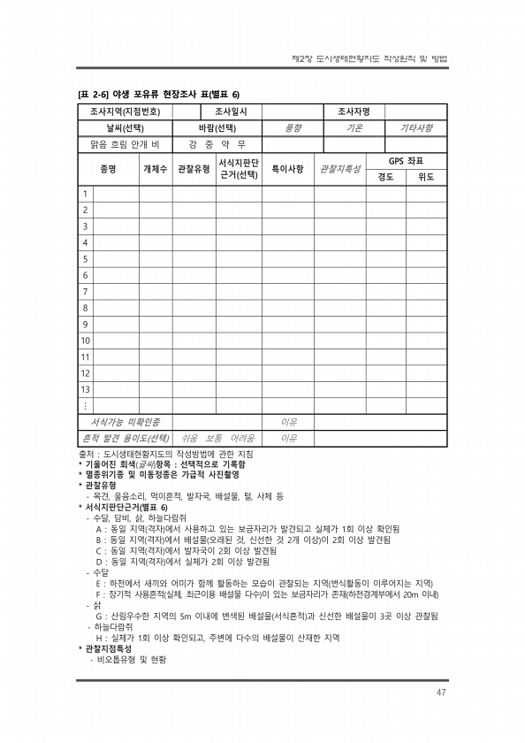 제2장 도시생태현황지도 작성원칙 및 방법 47 조사지역 지점번호 조사일시 조사자명 날씨 선택 바람 선택 풍향 기온 기타사항 맑음 흐림 안개 비 강 중 약 무 종명 개체수 관찰유형 서식지판단 근거 선택 특이사항 관찰지특성 GPS 좌표 경도 위도 1 2 3 4 5 6 7 8 9 10 11 12 13 ? 서식가능 미확인종 이유 흔적 발견 용이도 선택 쉬움 보통 어려움 이유 출처 도시생태현황지도의 작성방법에 관한 지침 * 기울어진 회색 글씨 항목 선택적으로 기록함 * 멸종위기종 및 미동정종은 가급적 사진촬영 * 관찰유형 목견, 울음소리, 먹이흔적, 발자국, 배설물, 털, 사체 등 * 서식지판단근거 별표 6 수달, 담비, 삵, 하늘다람쥐 A 동일 지역 격자 에서 사용하고 있는 보금자리가 발견되고 실체가 1회 이상 확...