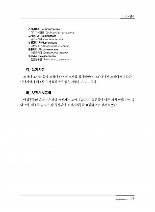II. 조사결과 www.nie.re.kr ? 47 가시덤불과 Caulacanthaceae 애기가시덤불 Caulacanthus usculathus 꼬시래기과 Gracilariaceae 잎꼬시래기 Gracilaria textorii 부챗살과 Phyllophoraceae 가는줄풀 Stenogramma interrupta 분홍치과 Rhodymeniaceae 누른끈적이 Chrysymenia wrightii 보라잎과 Delesseriaceae 잔금분홍잎 Acrosorium polyneurum 조간대 조사와 함께 조하대 다이빙 조사를 실시하였다. 조간대에서 조하대까지 암반이 이어지면서 해조류가 생육하기에 좋은 지형을 가지고 있다. 야생동물의 흔적이나 해양 쓰레기는 보이지 않았고, 출현종이 다른 섬에 비해 다소 많 았으며...