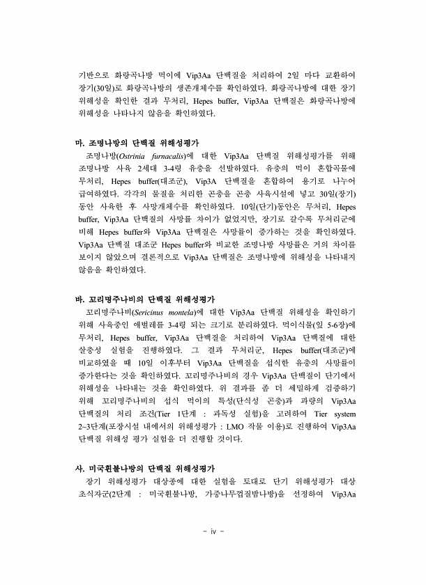 iv 기반으로 화랑곡나방 먹이에 Vip3Aa 단백질을 처리하여 2일 마다 교환하여 장기 30일 로 화랑곡나방의 생존개체수를 확인하였다. 화랑곡나방에 대한 장기 위해성을 확인한 결과 무처리, Hepes buffer, Vip3Aa 단백질은 화랑곡나방에 위해성을 나타나지 않음을 확인하였다. 마. 조명나방의 단백질 위해성평가 조명나방 Ostrinia furnacalis 에 대한 Vip3Aa 단백질 위해성평가를 위해 조명나방 사육 2세대 3-4령 유충을 선발하였다. 유충의 먹이 혼합곡물에 무처리, Hepes buffer 대조군 , Vip3A 단백질을 혼합하여 용기로 나누어 급여하였다. 각각의 물질을 처리한 곤충을 곤충 사육시설에 넣고 30일 장기 동안 사육한 후 사망개체수를 확인하였다. 10일 단기 동안은 무처리, ...