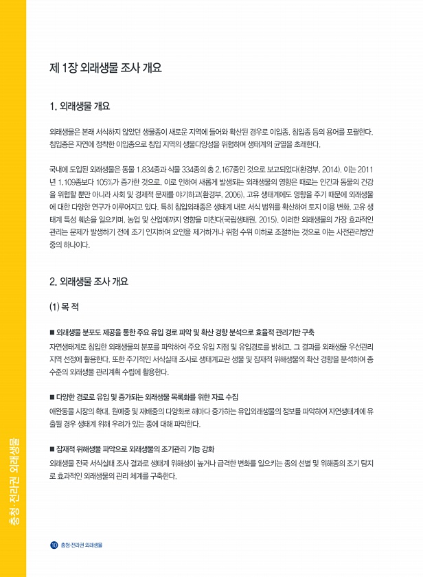 충청?전라권 외래생물 10 충청·전라권 외래생물 충청?전라권 외래생물 제 1장 외래생물 조사 개요 1. 외래생물 개요 외래생물은 본래 서식하지 않았던 생물종이 새로운 지역에 들어와 확산된 경우로 이입종, 침입종 등의 용어를 포괄한다. 침입종은 자연에 정착한 이입종으로 침입 지역의 생물다양성을 위협하며 생태계의 균열을 초래한다. 국내에 도입된 외래생물은 동물 1,834종과 식물 334종의 총 2,167종인 것으로 보고되었다 환경부, 2014 이는 2011 년 1,109종보다 105%가 증가한 것으로, 이로 인하여 새롭게 발생되는 외래생물의 영향은 때로는 인간과 동물의 건강 을 위협할 뿐만 아니라 사회 및 경제적 문제를 야기하고 환경부, 2006 , 고유 생태계에도 영향을 주기 때문에 외래생물 에 대한 다양한 ...