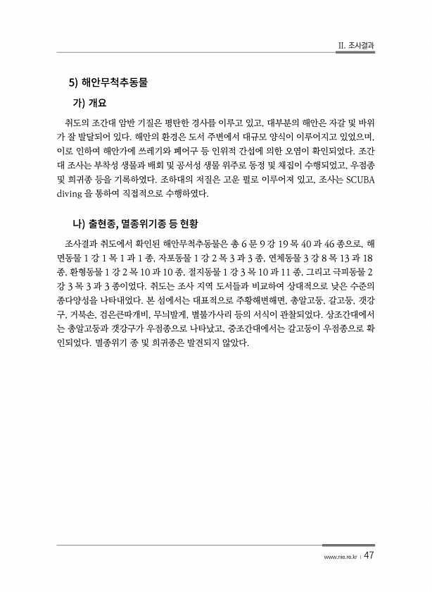 II. 조사결과 www.nie.re.kr ? 47 5 취도의 조간대 암반 기질은 평탄한 경사를 이루고 있고, 대부분의 해안은 자갈 및 바위 가 잘 발달되어 있다. 해안의 환경은 도서 주변에서 대규모 양식이 이루어지고 있었으며, 이로 인하여 해안가에 쓰레기와 폐어구 등 인위적 간섭에 의한 오염이 확인되었다. 조간 대 조사는 부착성 생물과 배회 및 공서성 생물 위주로 동정 및 채집이 수행되었고, 우점종 및 희귀종 등을 기록하였다. 조하대의 저질은 고운 펄로 이루어져 있고, 조사는 SCUBA diving 을 통하여 직접적으로 수행하였다. , 조사결과 취도에서 확인된 해안무척추동물은 총 6 문 9 강 19 목 40 과 46 종으로, 해 면동물 1 강 1 목 1 과 1 종, 자포동물 1 강 2 목 3 과 3 종, 연...