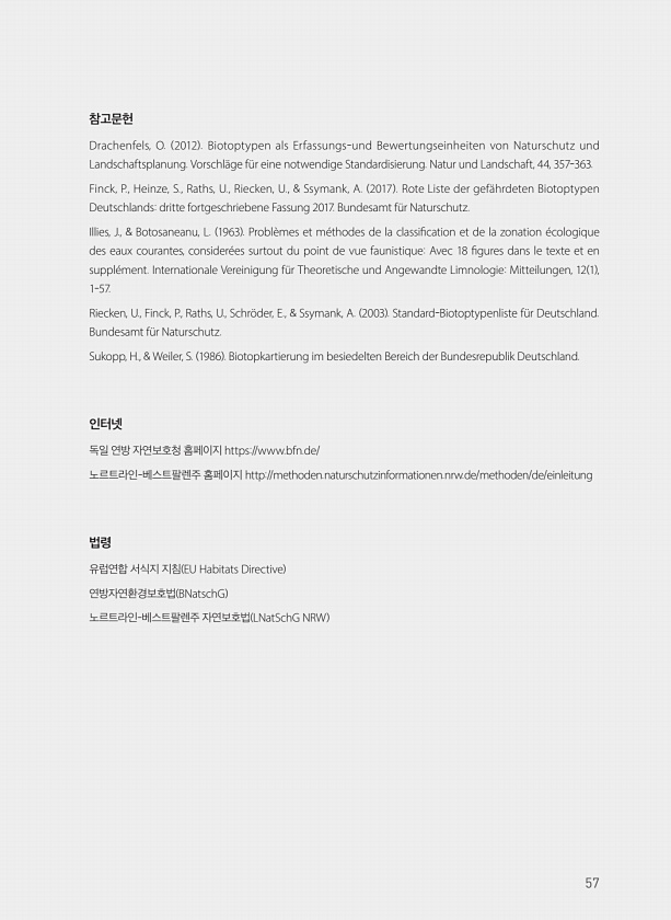참고문헌 Drachenfels, O. 2012 Biotoptypen als Erfassungs-und Bewertungseinheiten von Naturschutz und Landschaftsplanung. Vorschl?ge f?r eine notwendige Standardisierung. Natur und Landschaft, 44, 357-363. Finck, P., Heinze, S., Raths, U., Riecken, U., & Ssymank, A. 2017 Rote Liste der gef?hrdeten Biotoptypen Deutschlandsdritte fortgeschriebene Fassung 2017. Bundesamt f?r Naturschutz. Illies, J., & Bot...