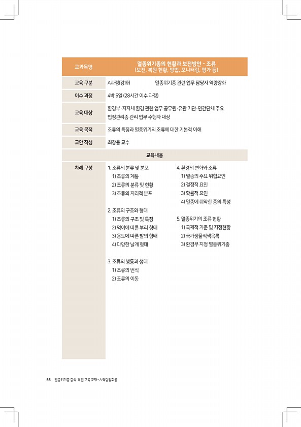 56 멸종위기종 증식·복원 교육 교재 A 역량강화용 교과목명 멸종위기종의 현황과 보전방안 조류 보전, 복원 현황, 방법, 모니터링, 평가 등 교육 구분 A과정 강화 멸종위기종 관련 업무 담당자 역량강화 이수 과정 4박 5일 28시간 이수 과정 교육 대상 환경부·지자체 환경 관련 업무 공무원·유관 기관·민간단체 주요 법정관리종 관리 업무 수행자 대상 교육 목적 조류의 특징과 멸종위기의 조류에 대한 기본적 이해 교안 작성 최창용 교수 교육내용 차례 구성 1. 조류의 분류 및 분포 1 조류의 계통 2 조류의 분류 및 현황 3 조류의 지리적 분포 2. 조류의 구조와 형태 1 조류의 구조 및 특징 2 먹이에 따른 부리 형태 3 용도에 따른 발의 형태 4 다양한 날개 형태 3. 조류의 행동과 생태 1 조류의 번식 2 ...