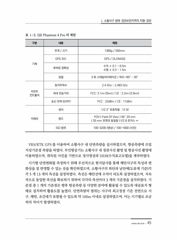 i. 소황사구 생태·경관보전지역의 지형·경관 www.nie.re.kr ? 45 구분 내용 제원 기체 무게 크기 1380g 350mm GPS 모드 GPS GLONASS 호버링 정확성 수직 ± 0.1 0.5m 수평 ± 0.3 1.5m 짐벌 3 축 스태빌라이제이션 피치 ?90° 30° 리모트 컨트롤러 동작주파수 2.4 Ghz 2.483 Ghz 최대 전송거리 FCC3.1mi 5km CE 2.2mi 3.5km 송신 전력 EIRP FCC 23dBm CE 17dBm 카메라 센서 1/2.3“ 유효픽셀 12 M 렌즈 FOV Field Of View 94° 20 mm 35 mm 포맷과 동일함 f/2.8 포커스 ∞ ISO 범위 1003200 영상 1001600 사진 표 ⅰ-3. DJI Phantom 4 Pro 의 제원 VRS/...