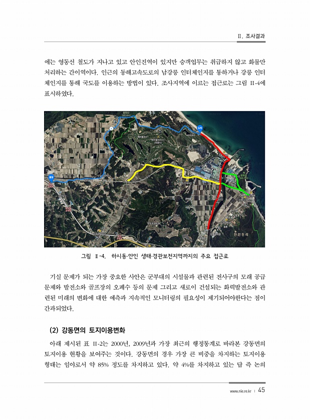 Ⅱ. 조사결과 www.nie.re.kr ? 45 에는 영동선 철도가 지나고 있고 안인진역이 있지만 승객업무는 취급하지 않고 화물만 처리하는 간이역이다. 인근의 동해고속도로의 남강릉 인터체인지를 통하거나 강릉 인터 체인지를 통해 국도를 이용하는 방법이 있다. 조사지역에 이르는 접근로는 그림 Ⅱ-4에 표시하였다. 그림 Ⅱ-4. 하시동·안인 생태·경관보전지역까지의 주요 접근로 기실 문제가 되는 가장 중요한 사안은 군부대의 시설물과 관련된 전사구의 모래 공급 문제와 발전소와 골프장의 오폐수 등의 문제 그리고 새로이 건설되는 화력발전소와 관 련된 미래의 변화에 대한 예측과 지속적인 모니터링의 필요성이 제기되어야한다는 점이 간과되었다. 2 강동면의 토지이용변화 아래 제시된 표 Ⅱ-2는 2000년, 2009년과 가장 최...