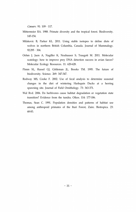 35 Conserv. 91109?117. Mittermeier RA. 1988. Primate diversity and the tropical forest. Biodiversity. 145-154. Milakovic B, Parker KL. 2011. Using stable isotopes to define diets of wolves in northern British Columbia, Canada. Journal of Mammalogy. 92295?304. Oehm J, Juen A, Nagiller K, Neuhauser S, Traugott M. 2011. Molecular scatologyhow to improve prey DNA detection success in avian faeces? Mol...