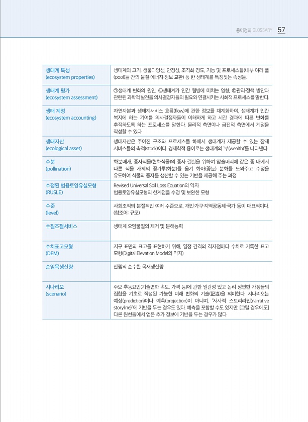 용어정의 GLOSSARY 57 생태계 특성 ecosystem properties 생태계의 크기, 생물다양성, 안정성, 조직화 정도, 기능 및 프로세스들 내부 여러 풀 pool 들 간의 물질·에너지·정보 교환 등 한 생태계를 특징짓는 속성들. 생태계 평가 ecosystem assessment ㉠생태계 변화의 원인, ㉡생태계가 인간 웰빙에 미치는 영향, ㉢관리·정책 방안과 관련된 과학적 발견을 의사결정자들의 필요와 연결시키는 사회적 프로세스를 말한다. 생태 계정 ecosystem accounting 자연자본과 생태계서비스 흐름 flow 에 관한 정보를 체계화하여, 생태계가 인간 복지에 하는 기여를 의사결정자들이 이해하게 하고 시간 경과에 따른 변화를 추적하도록 하는 프로세스를 말한다. 물리적 측면이나 금전적 측...