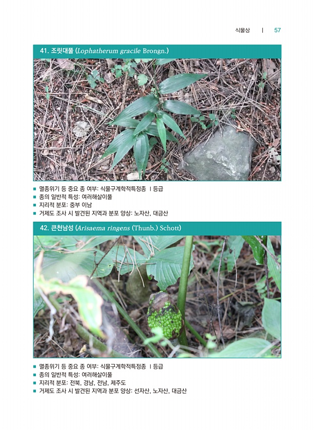 식물상 ┃ 57 ■ 멸종위기 등 중요 종 여부식물구계학적특정종 Ⅰ등급 ■ 종의 일반적 특성여러해살이풀 ■ 지리적 분포중부 이남 ■ 거제도 조사 시 발견된 지역과 분포 양상노자산, 대금산 ■ 멸종위기 등 중요 종 여부식물구계학적특정종 Ⅰ등급 ■ 종의 일반적 특성여러해살이풀 ■ 지리적 분포전북, 경남, 전남, 제주도 ■ 거제도 조사 시 발견된 지역과 분포 양상선자산, 노자산, 대금산 41. 조릿대풀 Lophatherum gracile Brongn. 42. 큰천남성 Arisaema ringens Thunb. Schott