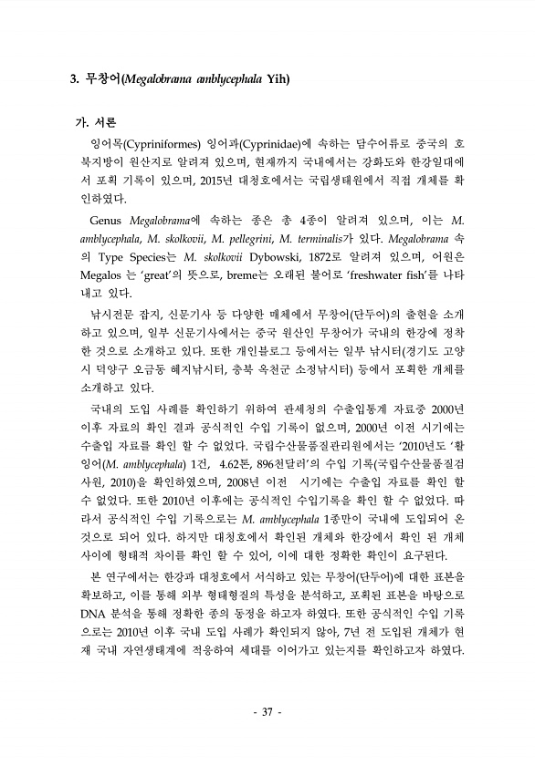 37 3. 무창어 Megalobrama amblycephala Yih 가. 서론 잉어목 Cypriniformes 잉어과 Cyprinidae 에 속하는 담수어류로 중국의 호 북지방이 원산지로 알려져 있으며, 현재까지 국내에서는 강화도와 한강일대에 서 포획 기록이 있으며, 2015년 대청호에서는 국립생태원에서 직접 개체를 확 인하였다. Genus Megalobrama에 속하는 종은 총 4종이 알려져 있으며, 이는 M. amblycephala, M. skolkovii, M. pellegrini, M. terminalis가 있다. Megalobrama 속 의 Type Species는 M. skolkovii Dybowski, 1872로 알려져 있으며, 어원은 Megalos 는 ‘great’의 뜻으로, breme는 오...