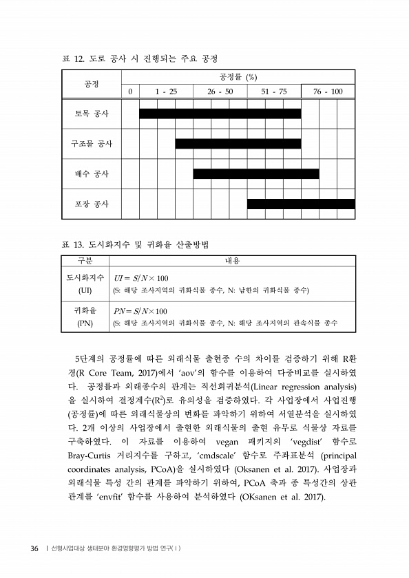 공정 공정률 토목 공사 구조물 공사 배수 공사 포장 공사 표 도로 공사 시 진행되는 주요 공정 구분 내용 도시화지수 × 해당 조사지역의 귀화식물 종수 남한의 귀화식물 종수 귀화율 × 해당 조사지역의 귀화식물 종수 해당 조사지역의 관속식물 종수 표 도시화지수 및 귀화율 산출방법 단계의 공정률에 따른 외래식물 출현종 수의 차이를 검증하기 위해 환 경 에서 의 함수를 이용하여 다중비교를 실시하였 다 공정률과 외래종수의 관계는 직선회귀분석 을 실시하여 결정계수 로 유의성을 검증하였다 각 사업장에서 사업진행 공정률 에 따른 외래식물상의 변화를 파악하기 위하여 서열분석을 실시하였 다 개 이상의 사업장에서 출현한 외래식물의 출현 유무로 식물상 자료를 구축하였다 이 자료를 이용...