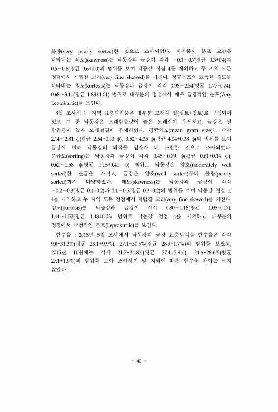 40 불량 very poorly sorted 한 것으로 조사되었다. 퇴적물의 분포 모양을 나타내는 왜도 skewness 는 낙동강과 금강이 각각 ?0.1∼0.7 평균 0.3±0.4 과 0.5∼0.6 평균 0.6±0.0 의 범위를 보여 낙동강 정점 4를 제외하고 두 지역 모든 정점에서 세립질 꼬리 very fine skewed 를 가진다. 정규분포의 뾰족한 정도를 나타내는 첨도 kurtosis 는 낙동강과 금강이 각각 0.98∼2.54 평균 1.77±0.74 , 0.68∼3.11 평균 1.88±1.01 범위로 대부분의 정점에서 매우 급첨적인 분포 Very Leptokurtic 를 보인다. 8월 조사시 두 지역 표층퇴적물은 대부분 모래와 펄 실트+점토 로 구성되어 있고 그 중 낙동강은 모래함유량이 높은 모래질이...