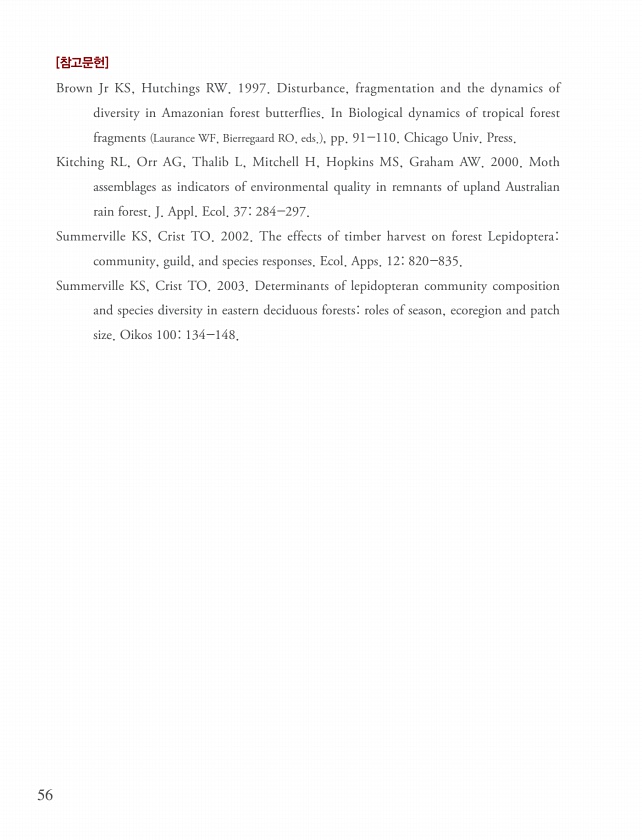 56 [참고문헌] Brown Jr KS, Hutchings RW. 1997. Disturbance, fragmentation and the dynamics of diversity in Amazonian forest butterflies. In Biological dynamics of tropical forest fragments Laurance WF, Bierregaard RO, eds. , pp. 91-110. Chicago Univ. Press. Kitching RL, Orr AG, Thalib L, Mitchell H, Hopkins MS, Graham AW. 2000. Moth assemblages as indicators of environmental quality in remnants of upl...