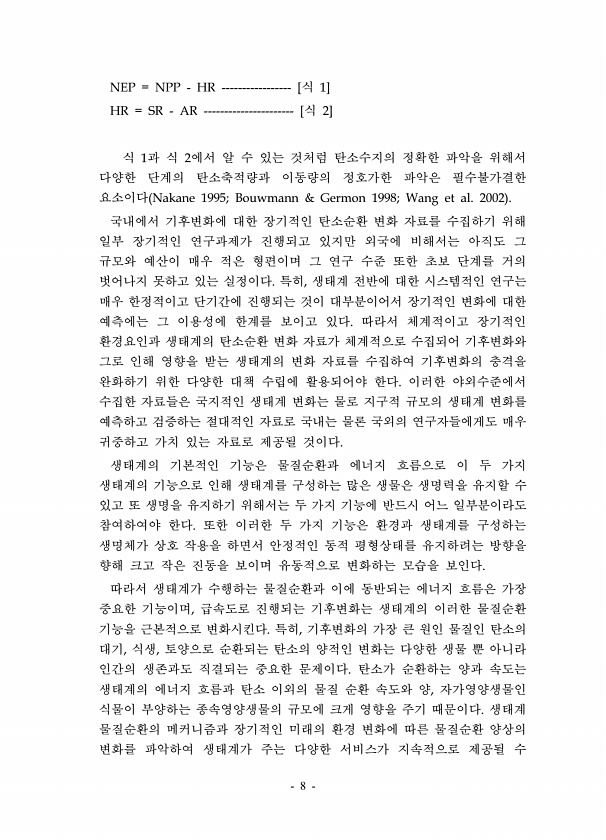 8 NEP = NPP HR ----------------- [식 1] HR = SR AR ---------------------- [식 2] 식 1과 식 2에서 알 수 있는 것처럼 탄소수지의 정확한 파악을 위해서 다양한 단계의 탄소축적량과 이동량의 정호가한 파악은 필수불가결한 요소이다 Nakane 1995; Bouwmann & Germon 1998; Wang et al. 2002 국내에서 기후변화에 대한 장기적인 탄소순환 변화 자료를 수집하기 위해 일부 장기적인 연구과제가 진행되고 있지만 외국에 비해서는 아직도 그 규모와 예산이 매우 적은 형편이며 그 연구 수준 또한 초보 단계를 거의 벗어나지 못하고 있는 실정이다. 특히, 생태계 전반에 대한 시스템적인 연구는 매우 한정적이고 단기간에 진행되는 것이 대부분이...