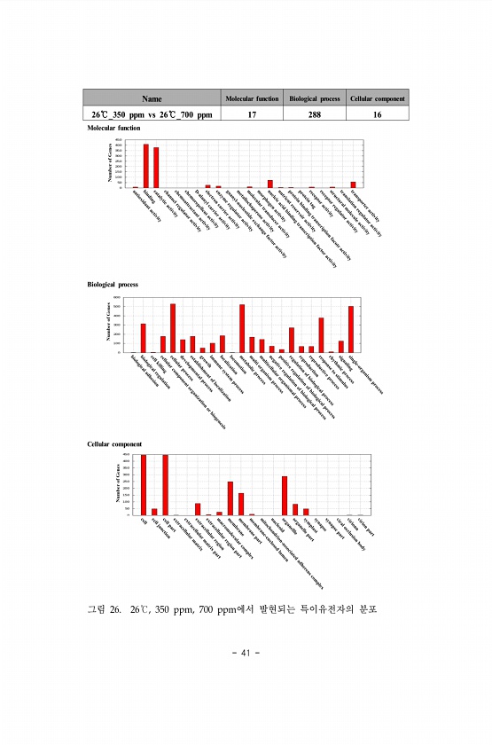 41 Name Molecular function Biological process Cellular component 26℃_350 ppm vs 26℃_700 ppm 17 288 16 Molecular function Biological process Cellular component 그림 26. 26℃, 350 ppm, 700 ppm에서 발현되는 특이유전자의분포