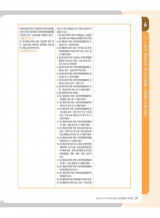 6 환경부 유전자변형생물체 안전관리 가이드 _57 1 L M O 법령단위 비교표 법률- 시행령- 시행규칙 위하여 필요하다고 인정하면 관계 중앙행정 기관의 장과 협의하여 유전자변형생물체를 수입하는 항구ㆍ공항 등을 지정할 수 있다. 개정 2012.12.11 ② 국가책임기관의 장은 제1항에 따라 항 구ㆍ공항 등을 지정하는 경우에는 지체 없 이 이를 공고하여야 한다. [전문개정 2007.12.21] 다음 각 호의 권한을 소속 기관의 장에게 위 임할 수 있다. 1. 법 제7조의2에 따른 위해성심사, 위해성 심사 협의 및 위해성심사대행기관의 지정 2. 법 제8조에 따른 유전자변형생물체의 수 입승인 및 그 결과의 통보 3. 법 제9조에 따른 시험ㆍ연구용 등의 유전 자변형생물체 수입신고의 접수, 승인 및 그 내용의 통보 ...