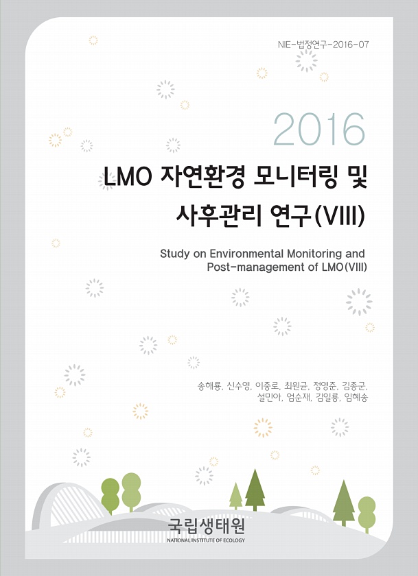2016 LMO 자연환경 모니터링 및 사후관리 연구 VIII Study on Environmental Monitoring and Post-management of LMO VIII 송해룡, 신수영, 이중로, 최원균, 정영준, 김종군, 설민아, 엄순재, 김일룡, 임혜송NIE-법정연구-2016-07
