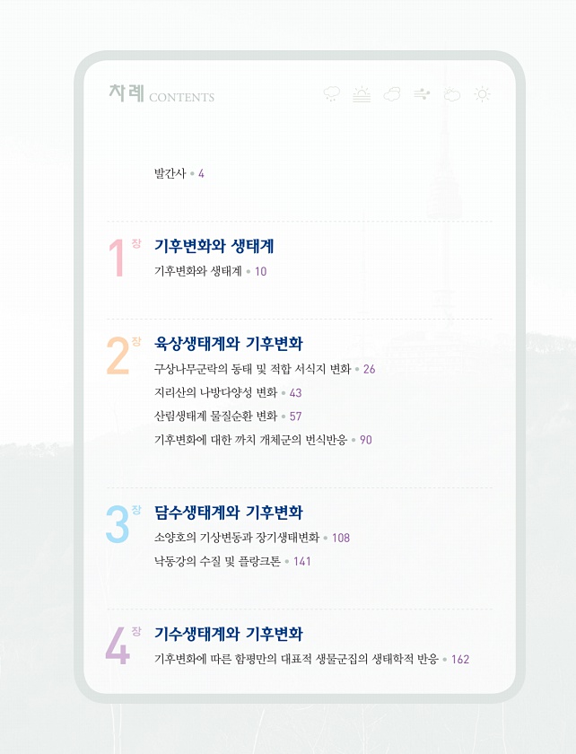발간사 ? 4 기후변화와 생태계 기후변화와 생태계 ? 10 육상생태계와 기후변화 구상나무군락의 동태 및 적합 서식지 변화 ? 26 지리산의 나방다양성 변화 ? 43 산림생태계 물질순환 변화 ? 57 기후변화에 대한 까치 개체군의 번식반응 ? 90 담수생태계와 기후변화 소양호의 기상변동과 장기생태변화 ? 108 낙동강의 수질 및 플랑크톤 ? 141 기수생태계와 기후변화 기후변화에 따른 함평만의 대표적 생물군집의 생태학적 반응 ? 162 1장 2장 3장 4장 차례CONTENTS