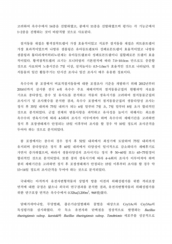 고려하여 옥수수에서 14종을 선발하였고, 콩에서 11종을 선발하였으며 평가는 각 기능군에서 12종을 진행하는 것이 바람직할 것으로 사료된다. 절지동물 채집은 황색점착트랩이 가장 효율적이었고 지표부 절지동물 채집은 피트폴트랩이 가장 효과적이었으며 나방류 샘플링은 유아등트랩보다 성페로몬트랩이 효율적이었고 나방류 샘플링과 톱다리개미허리노린재는 유아등트랩보다 성페로몬트랩이나 집합페로몬 트랩이 효율 적이었다. 황색점착트랩의 크기는 모니터링의 기본원칙에 따라 7.0×10.0cm 만으로도 충분할 것으로 사료되며 노출시간은 7일 이상, 설치높이는 0.51.0m가 효율적인 것으로 나타났다. 절 지동물의 일간 활동주기는 단시간 조사나 일간 조사시 매우 유용한 정보이다. 옥수수와 콩 포장에서 비표적절지동물에 대한 포장조사 기준...