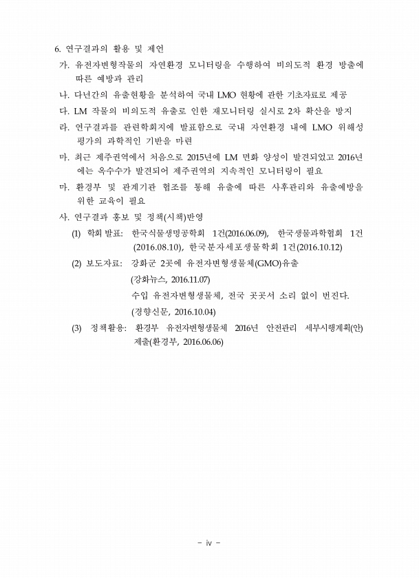 6. 연구결과의 활용 및 제언 가. 유전자변형작물의 자연환경 모니터링을 수행하여 비의도적 환경 방출에 따른 예방과 관리 나. 다년간의 유출현황을 분석하여 국내 LMO 현황에 관한 기초자료로 제공 다. LM 작물의 비의도적 유출로 인한 재모니터링 실시로 2차 확산을 방지 라. 연구결과를 관련학회지에 발표함으로 국내 자연환경 내에 LMO 위해성 평가의 과학적인 기반을 마련 마. 최근 제주권역에서 처음으로 2015년에 LM 면화 양성이 발견되었고 2016년 에는 옥수수가 발견되어 제주권역의 지속적인 모니터링이 필요 마. 환경부 및 관계기관 협조를 통해 유출에 따른 사후관리와 유출예방을 위한 교육이 필요 사. 연구결과 홍보 및 정책 시책 반영 1 학회 발표한국식물생명공학회 1건 2016.06.09 , 한국생물과학협...