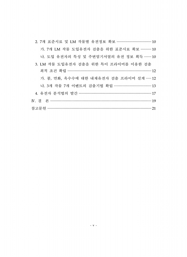 v 2. 7개 표준시료 및 LM 작물별 유전정보 확보 ····································10 가. 7개 LM 작물 도입유전자 검출을 위한 표준시료 확보 ··········· 10 나. 도입 유전자의 특성 및 주변염기서열의 유전 정보 획득 ······· 10 3. LM 작물 도입유전자 검출을 위한 특이 프라이머를 이용한 검출 최적 조건 확립 ························································································12 가. 콩, 면화, 옥수수에 대한 내재유전자 검출 프라이머 설계 ····· 12 나. 3개 작물 7개 이벤트의 검출기법 확립 ································...