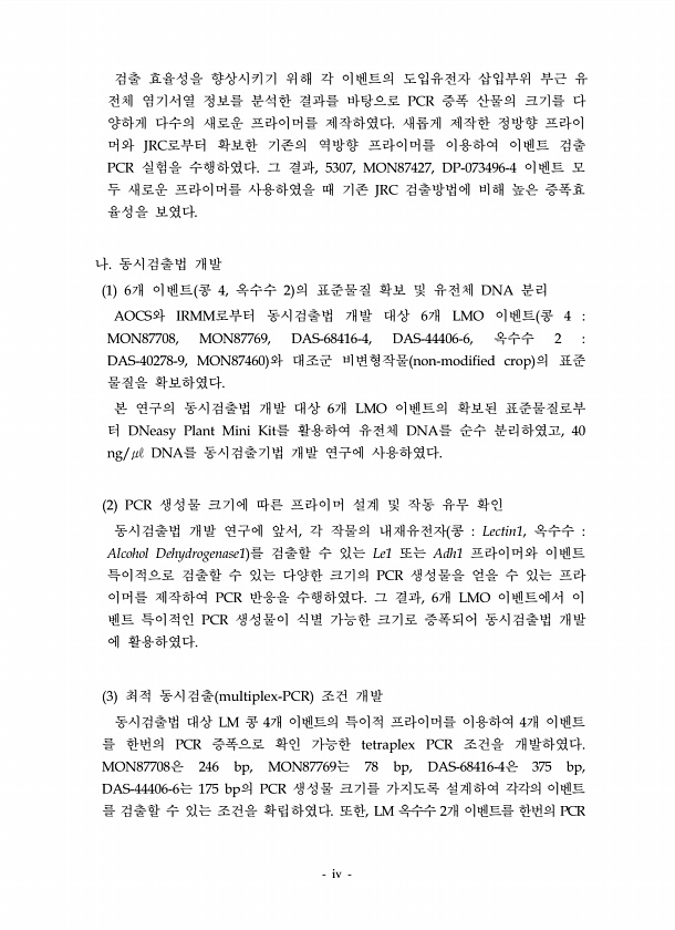 iv 검출 효율성을 향상시키기 위해 각 이벤트의 도입유전자 삽입부위 부근 유 전체 염기서열 정보를 분석한 결과를 바탕으로 PCR 증폭 산물의 크기를 다 양하게 다수의 새로운 프라이머를 제작하였다. 새롭게 제작한 정방향 프라이 머와 JRC로부터 확보한 기존의 역방향 프라이머를 이용하여 이벤트 검출 PCR 실험을 수행하였다. 그 결과, 5307, MON87427, DP-073496-4 이벤트 모 두 새로운 프라이머를 사용하였을 때 기존 JRC 검출방법에 비해 높은 증폭효 율성을 보였다. 나. 동시검출법 개발 1 6개 이벤트 콩 4, 옥수수 2 의 표준물질 확보 및 유전체 DNA 분리 AOCS와 IRMM로부터 동시검출법 개발 대상 6개 LMO 이벤트 콩 4 MON87708, MON87769, DAS-68416-4...
