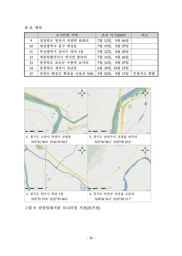 33 모니터링 지역 조사 시기 2017 비고 9 경상북도 영천시 자양면 용화리 7월 12일, 9월 06일 10 대전광역시 동구 대성동 7월 19일, 9월 07일 11 부산광역시 강서구 대저 1동 7월 12일, 9월 05일 12 세종특별자치시 연서면 봉암리 7월 14일, 9월 06일 13 충청북도 보은군 수한면 묘서리 7월 14일, 9월 07일 14 충청북도 제천시 천남동 6월 18일, 10월 12일 15 강원도 화천군 화천읍 신읍리 1041 5월 24일, 9월 13일 인접지소 병합 표 8. 계속 1. 경기도 고양시 덕양구 신원동 N37˚41´00.0˝ E126˚53´04.5˝ 2. 경기도 남양주시 진접읍 내곡리 N37˚40´08.2˝ E127˚09´10.0˝ 3. 경기도 양주시 회천 1동 N37˚51´15....