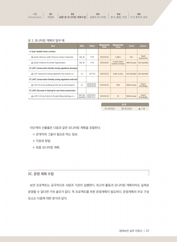 생태보전 실무 지침서 | 57 서론 Introduction 01 개념화 02 실행 및 모니터링 계획수립 03 실행과 모니터링 04 분석, 활용, 조정 05 지식 획득과 공유 표 2. 모니터링 계획의 일부 예 Item Who When Measurement Date Measurement Value Trend Source Goal. Healthy forest corridors Goal1a. Minimum width of forest corridor in kilometer AM, JB FY15 2013.03.25 2.25km Flat Rapid Assessment Goal1b. Evidence of corridor fragmentation AM, JB FY15 2013.03.25 corridor is broken ...