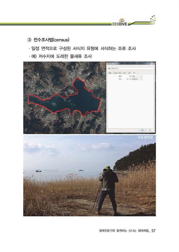 생태전문가와 함께하는 신나는 생태체험_ 57 ③ 전수조사법 census ·일정 면적으로 구성된 서식지 유형에 서식하는 조류 조사 ·예 저수지에 도래한 물새류조사
